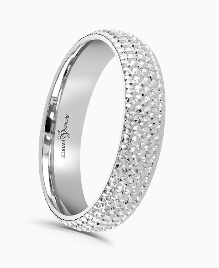 Handcrafted by Brown & Newirth; our classic court profile elevated by pearl cuts across the surface, presented in a heavy gauge. Part of the Icon Collection