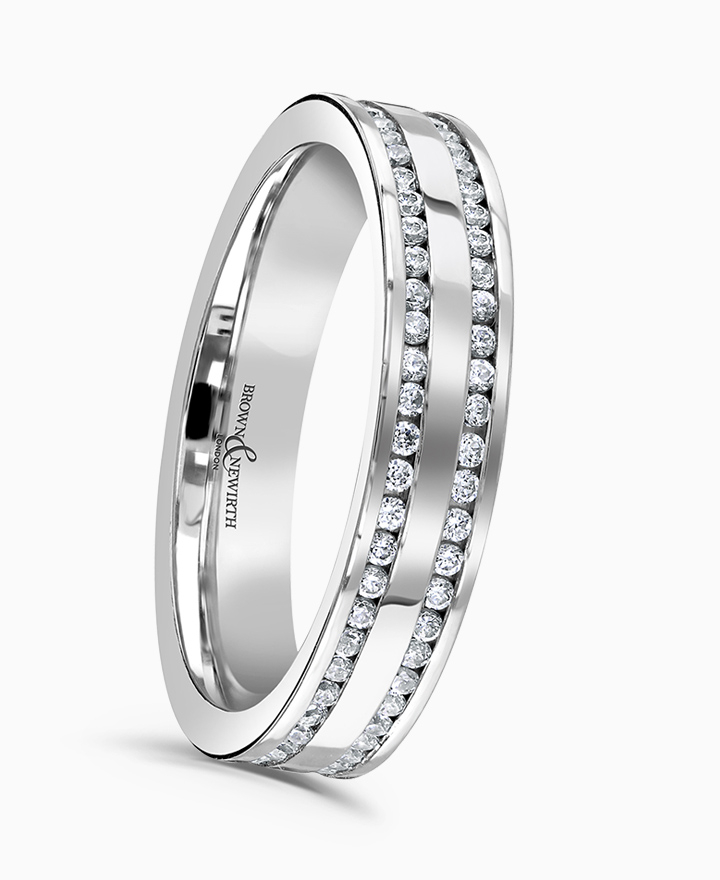 Handcrafted by Brown & Newirth; a double row of round brilliant cut diamonds totalling 0.56ct adorn the full hoop of this modern court band. Total carat weight 0.56ct