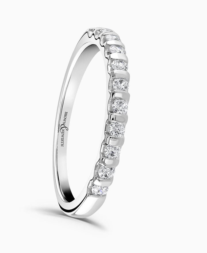 Handcrafted by Brown & Newirth; a total of 0.25ct round brilliant cut diamonds adorn 45% of this square edged band. Total carat weight 0.25ct