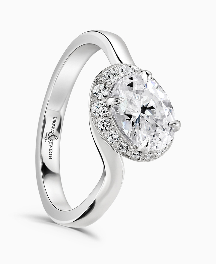Handcrafted by Brown & Newirth; inspired by nature, diamonds wrap around to frame a 1.00ct oval cut diamond, presented here on a classic court band. Total 1.15ct. Part of the Entwined Collection.
