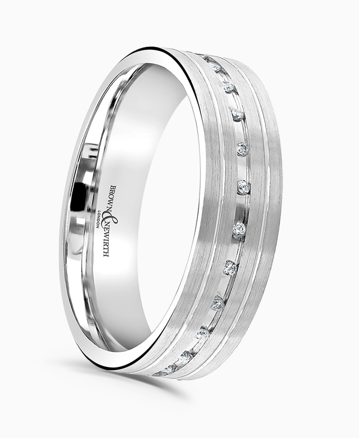 Handcrafted by Brown & Newirth; a row of round brilliant cut diamonds set around the full hoop in a polished centre groove with contrasting v-cut rails, presented on a flat band. Total carat weight 0.13ct