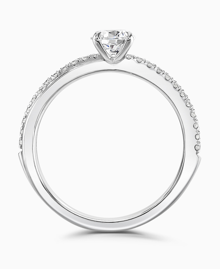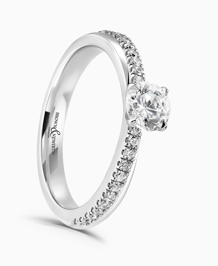 Handcrafted by Brown & Newirth; inspired by nature, diamonds sweep across towards a finely set 0.50ct round brilliant cut diamond, presented here on diamond set band and totalling 0.66ct. Part of the Entwined Collection.