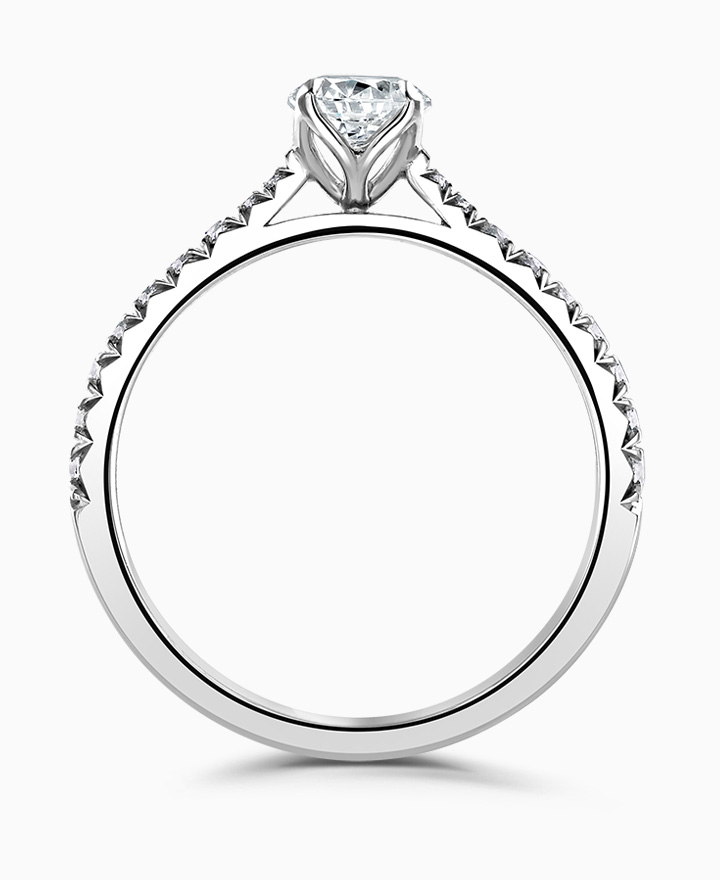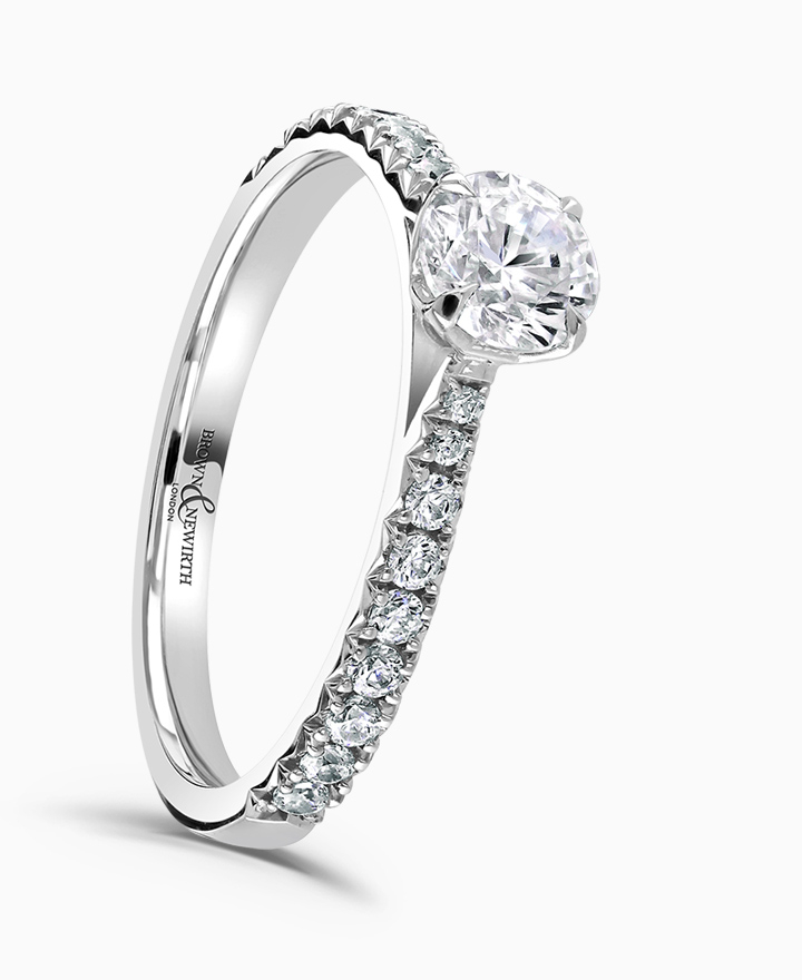 Handcrafted by Brown & Newirth; our signature 'bloom' floral detailing for a 0.50ct round brilliant cut diamond, presented here with diamond set shoulders and a total 0.73ct. Part of the Bloom Collection.