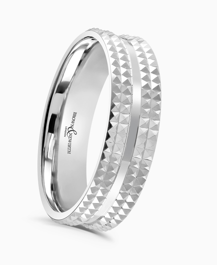 Handcrafted by Brown & Newirth; our flat top profile with knurled patterning, contrasting centre line detail and straight edges, presented in a medium gauge. Part of the Guilloche Collection
