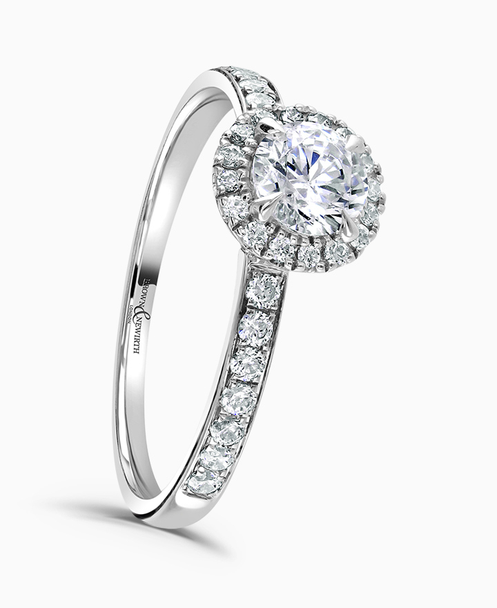 Handcrafted by Brown & Newirth; a diamond halo frames the 0.50ct round brilliant cut diamond, presented here with diamond set shoulders. Total 0.80ct