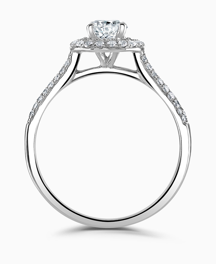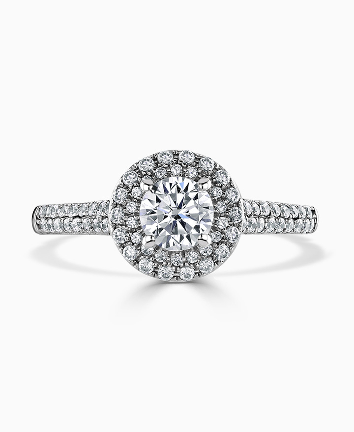 Handcrafted by Brown & Newirth; a double-row diamond halo frames the 0.50ct round brilliant cut diamond, presented here with double row diamond set shoulders. Total 0.79ct.