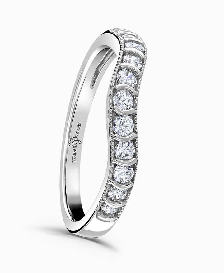 Handcrafted by Brown & Newirth; round brilliant cut diamonds flow through the curve of this classic court band finished with a mill grain edge. Total carat weight 0.33ct