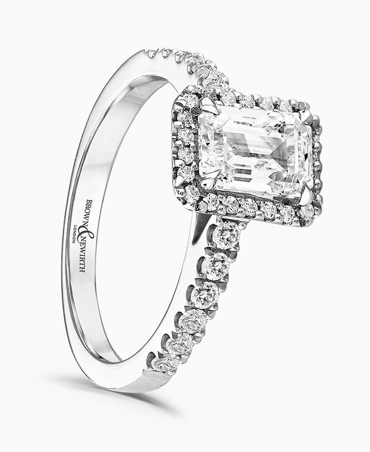 Handcrafted by Brown & Newirth; our signature 'bloom' floral detailing with diamond halo framing a rectangular emerald cut diamond, presented here on a diamond set band. Centre 0.70ct, total 1.00ct. Part of the Bloom Collection.