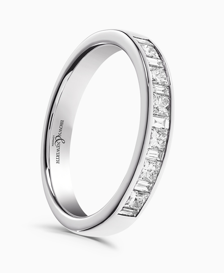 Handcrafted by Brown & Newirth; square princess and rectangular baguette cut diamonds sit edge to edge adorning 30% of this straight edged band. Total carat weight 0.50ct