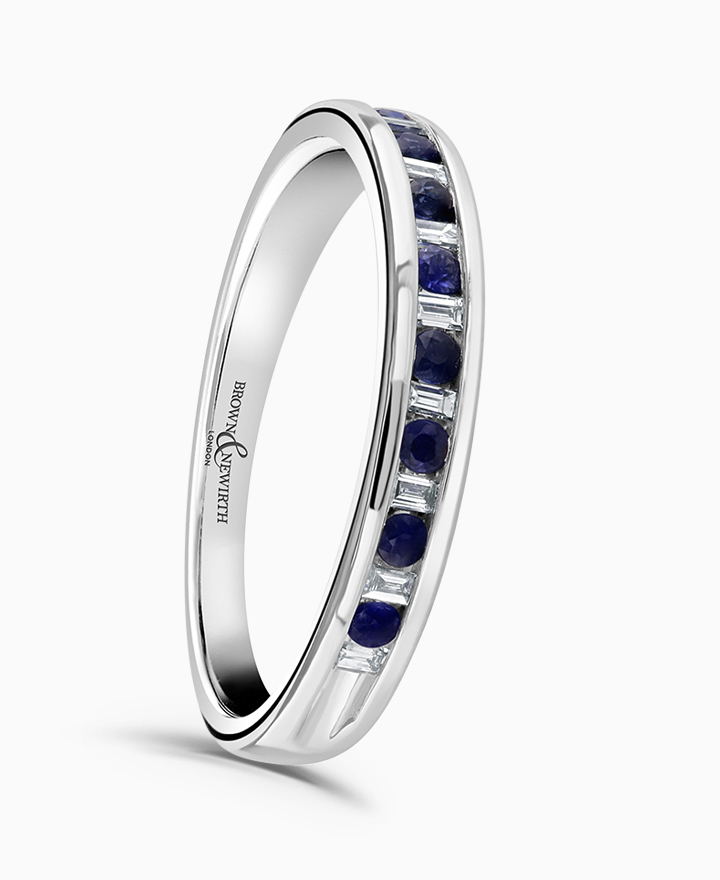 Handcrafted by Brown & Newirth; round brilliant and rectangular baguette cut diamonds and blue sapphires adorn 30% of this classic court band. Total carat weight 0.28ct