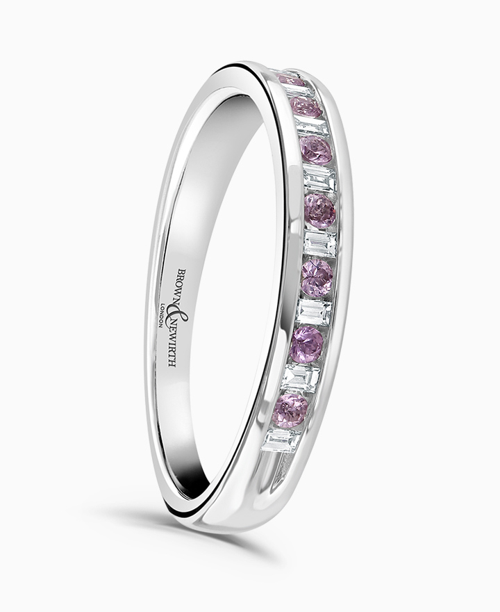 Handcrafted by Brown & Newirth; round brilliant and rectangular baguette cut diamonds and pink sapphires adorn 30% of this classic court band. Total carat weight 0.28ct
