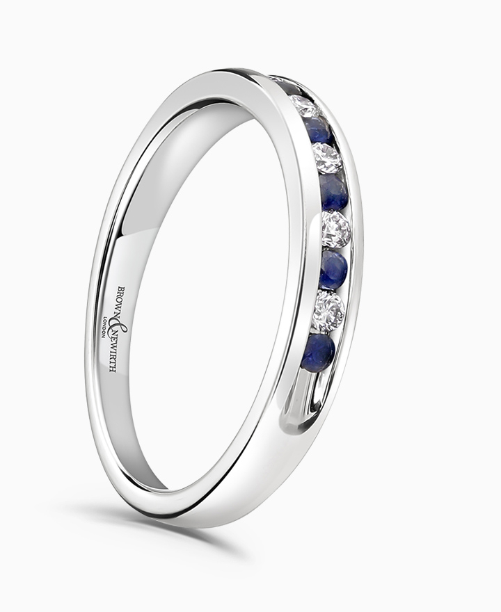 Handcrafted by Brown & Newirth; round brilliant cut diamonds and blue sapphires adorn 22% of this classic court band. Total carat weight 0.20ct