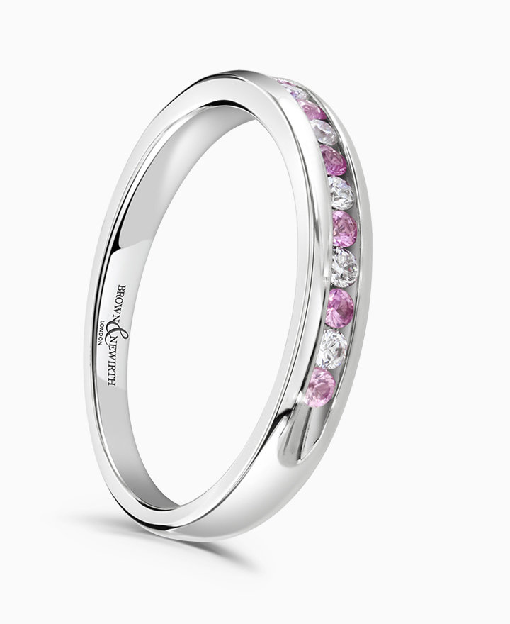 Handcrafted by Brown & Newirth; round brilliant cut diamonds and pink sapphires adorn 33% of this classic court band. Total carat weight 0.20ct
