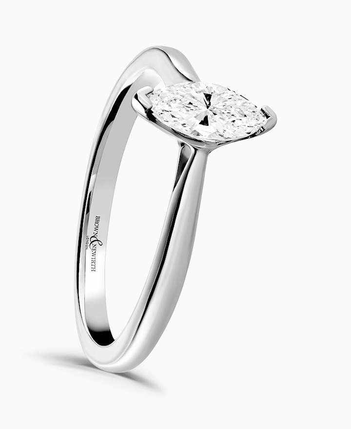 Handcrafted by Brown & Newirth; a delicate four claw setting perfectly elevates the leafy marquise cut diamond, presented here on a classic court band. 0.50ct