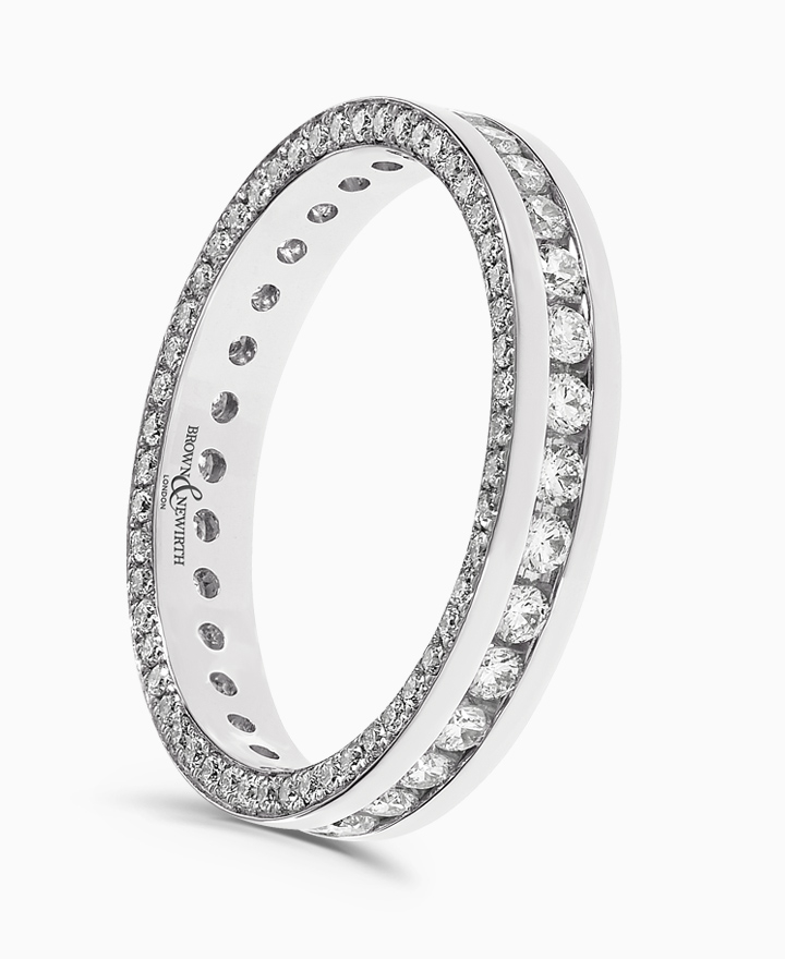 Handcrafted by Brown & Newirth; a full hoop of round brilliant diamonds elevated by matching side-set diamonds. Part of the Opulence Collection. Total carat weight 1.00ct
