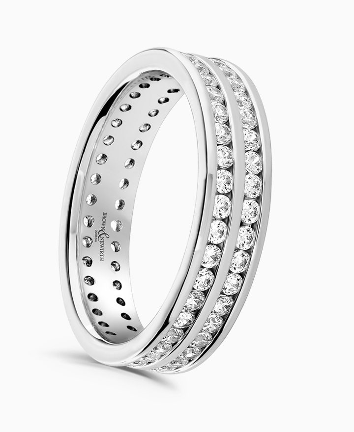 Handcrafted by Brown & Newirth; a double row of round brilliant cut diamonds adorn the full hoop of this square edged band. Total carat weight 2.00ct