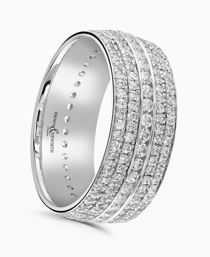 Handcrafted by Brown & Newirth; five rows of round brilliant cut diamonds in a pave setting adorn the full hoop of this classic court band. Total carat weight 1.25ct