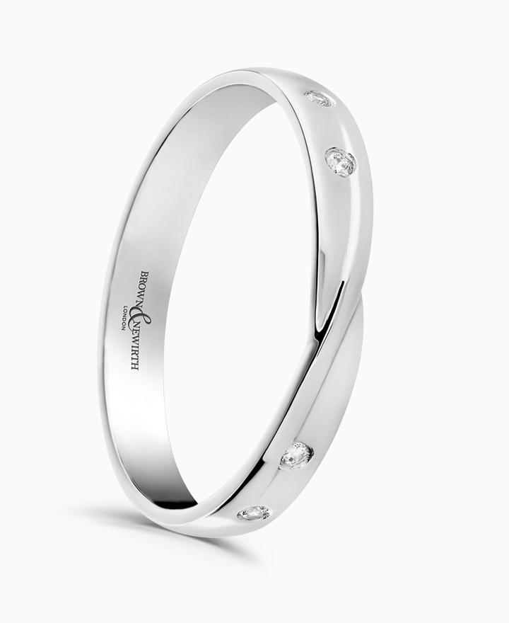 Handcrafted by Brown & Newirth; round brilliant cut diamonds are set either side of the pinch on this bow design, presented on a classic court band. Total carat weight 0.03ct