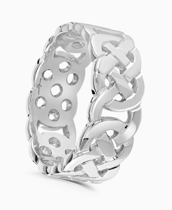 Handcrafted by Brown & Newirth; our open work Celtic design on a flat profile, presented in a medium gauge.
