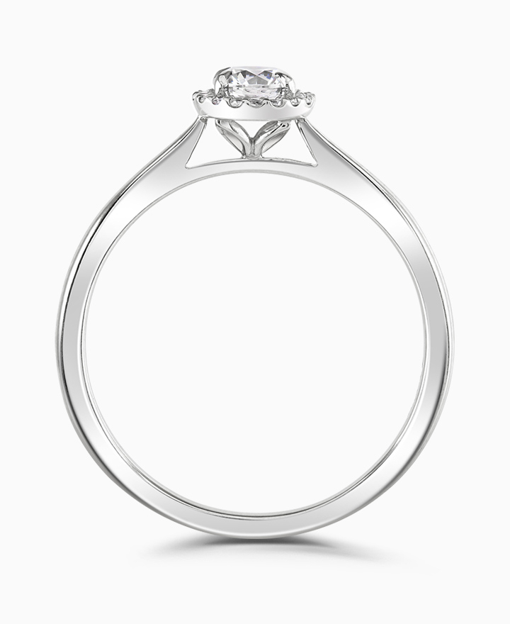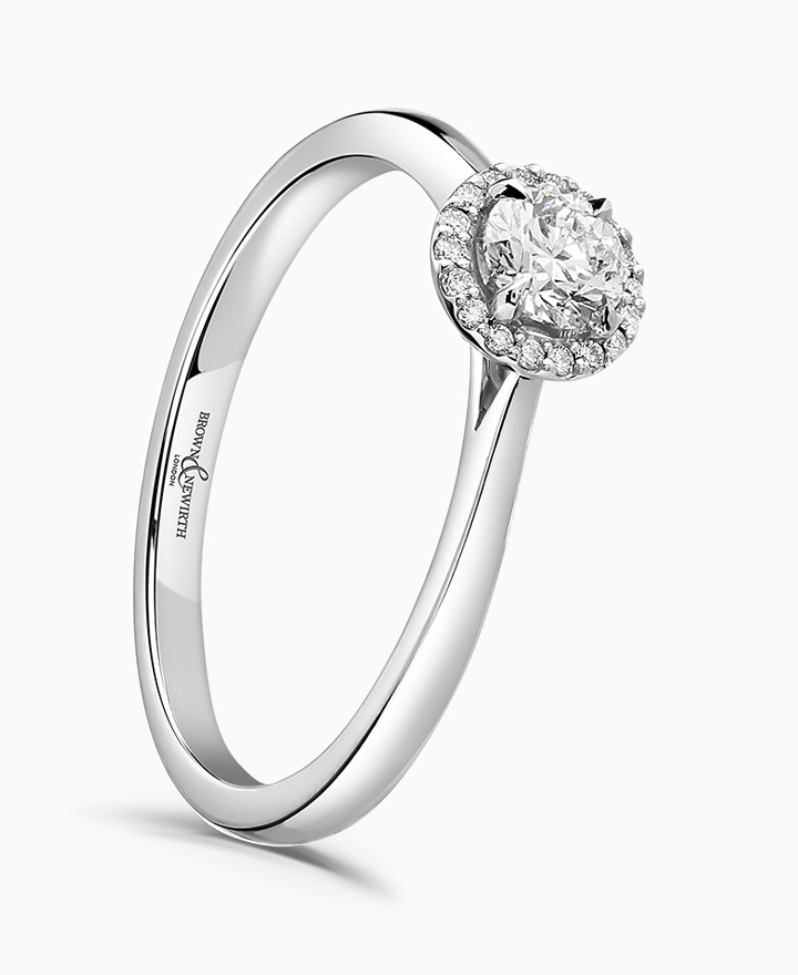 Handcrafted by Brown & Newirth; our signature 'bloom' floral detailing with diamond halo framing a round brilliant cut diamond, presented here on a classic court band. Centre 0.25ct, total 0.28ct. Part of the Bloom Collection.