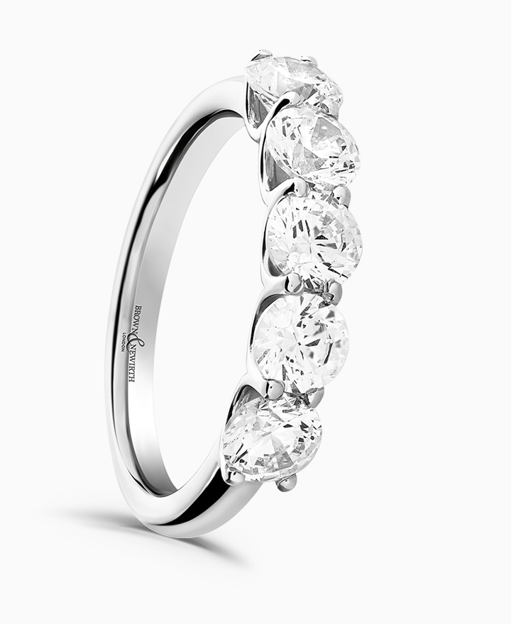 Handcrafted by Brown & Newirth; a cupped claw setting elevates these five round brilliant cut diamonds, presented here on a classic court band. Five 0.30ct, total 1.50ct