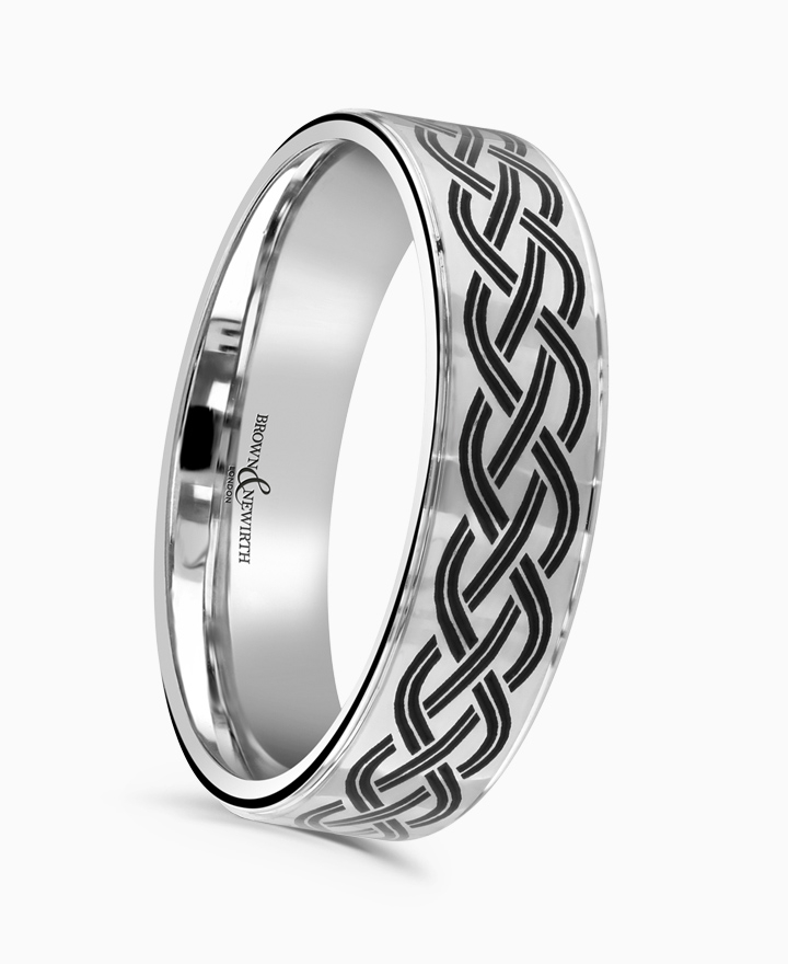 Handcrafted by Brown & Newirth; our flat top profile with Celtic knot detail inlayed with black ceramic, finished with dropped edges. Presented in a medium gauge.