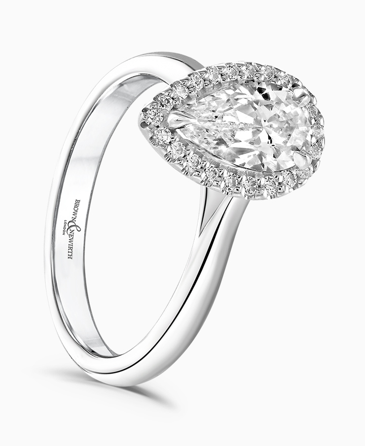 Handcrafted by Brown & Newirth; our signature 'bloom' floral detailing with diamond halo framing a pear cut G Vs diamond, presented here on a classic court band. Centre 0.50ct, total 0.55ct. Part of the Bloom Collection.