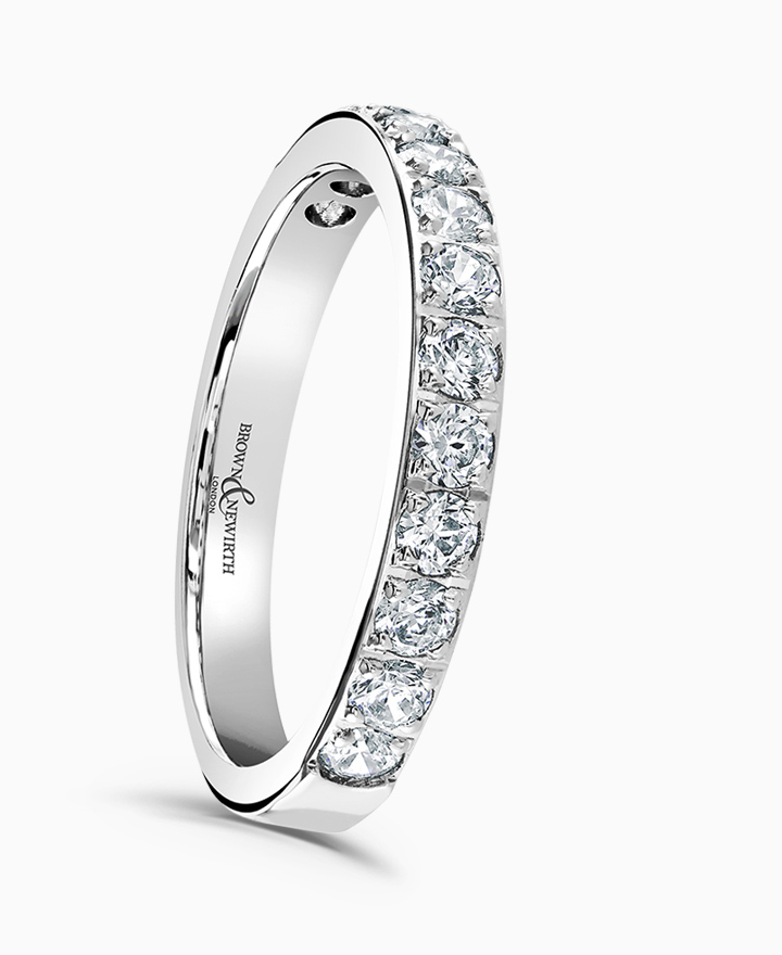Handcrafted by Brown & Newirth; round brilliant cut diamonds adorn 50% of this modern court band. Total carat weight 0.75ct