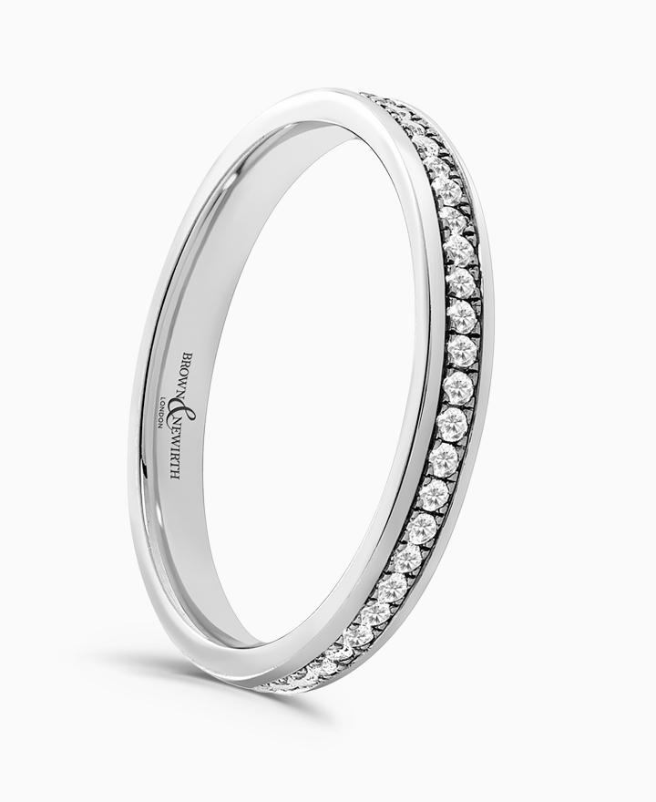 Handcrafted by Brown & Newirth; round brilliant cut diamonds adorn the full hoop of this straight edged band. Total carat weight 0.25ct
