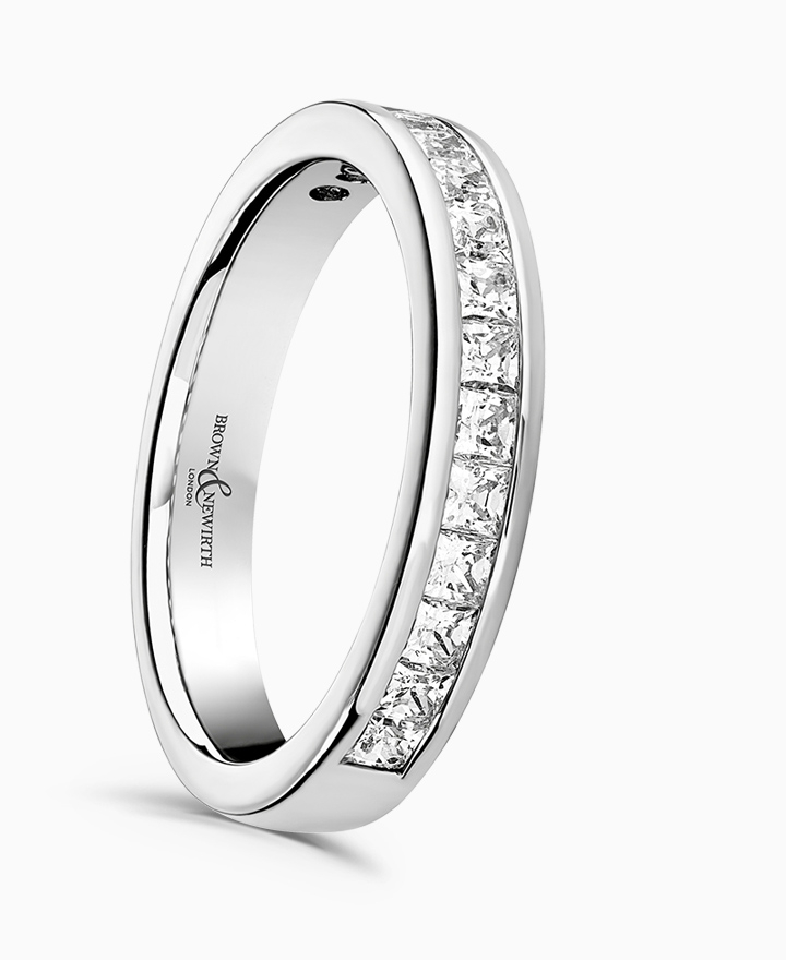 Handcrafted by Brown & Newirth; square princess cut diamonds sit edge to edge adorning 50% of this straight edged band. Total carat weight 0.75ct