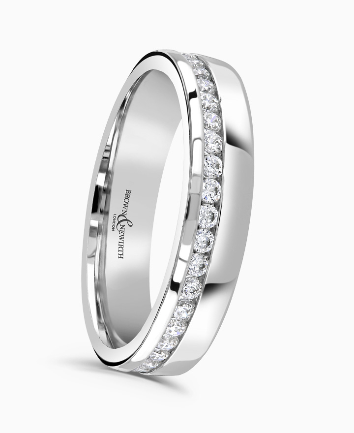 Handcrafted by Brown & Newirth; round brilliant cut diamonds set along the edge adorning 50% of this modern court band. Total carat weight 0.25ct