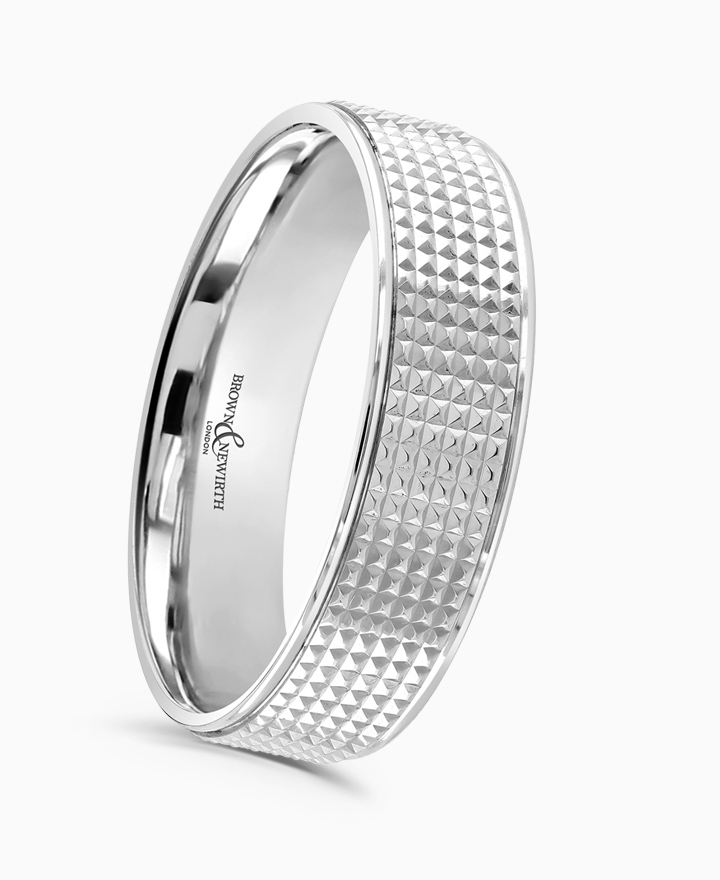 Handcrafted by Brown & Newirth; our flat top profile with knurled patterning and contrasting polished rolled edges, presented in a medium gauge. Part of the Guilloche Collection