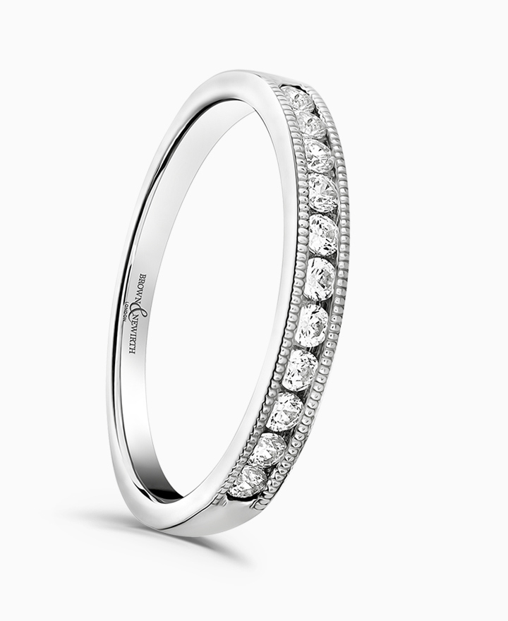 Handcrafted by Brown & Newirth; round brilliant cut diamonds adorn 40% of this classic court band finished with a mill grain edge. Total carat weight 0.25ct