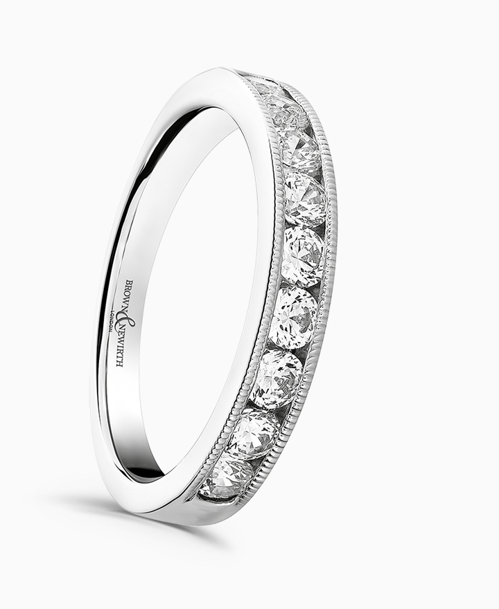 Handcrafted by Brown & Newirth; round brilliant cut diamonds adorn 40% of this classic court band finished with a mill grain edge. Total carat weight 0.77ct