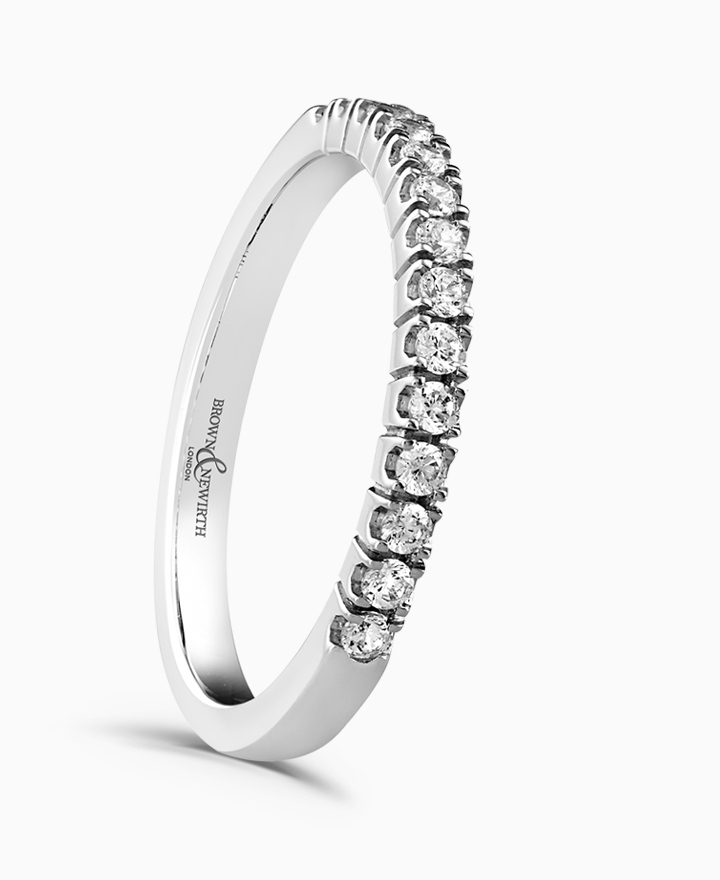 Handcrafted by Brown & Newirth; open set round brilliant cut diamonds adorn 45% of this straight edged band. Total carat weight 0.25ct. This is part of our in stock range, available in platinum & 18ct yellow gold. Order today for quick delivery.