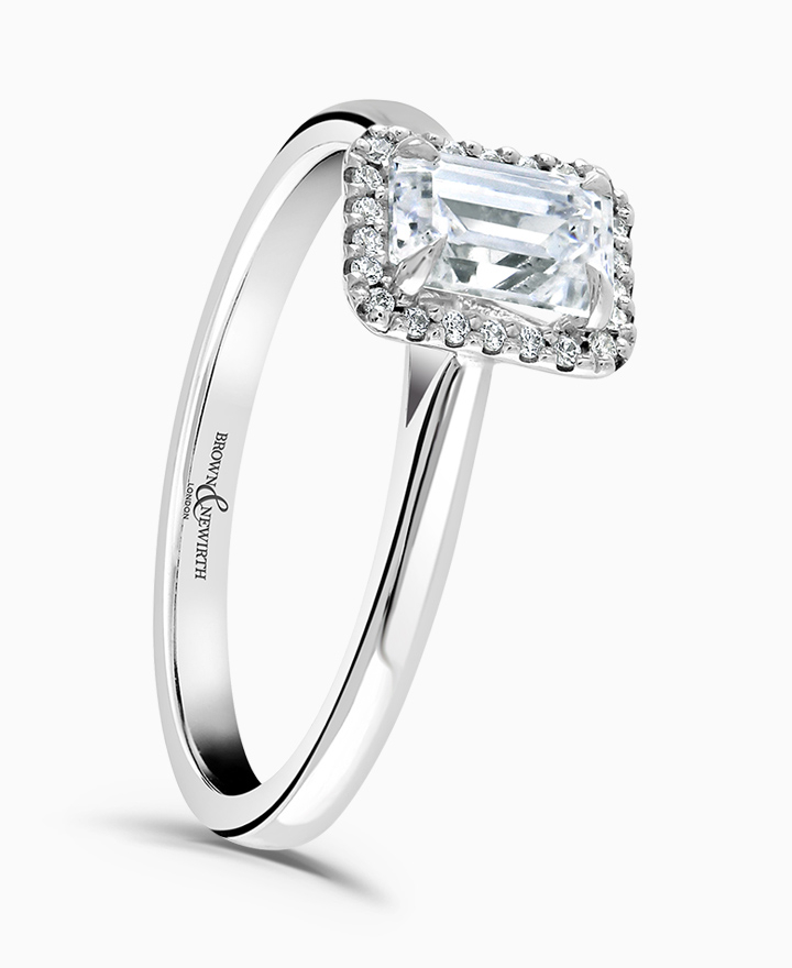 Handcrafted by Brown & Newirth; our signature 'bloom' floral detailing with diamond halo framing a rectangular emerald cut diamond, presented here on a classic court band. Centre 0.50ct, total 0.54ct. Part of the Bloom Collection.