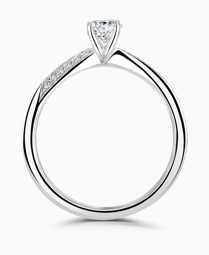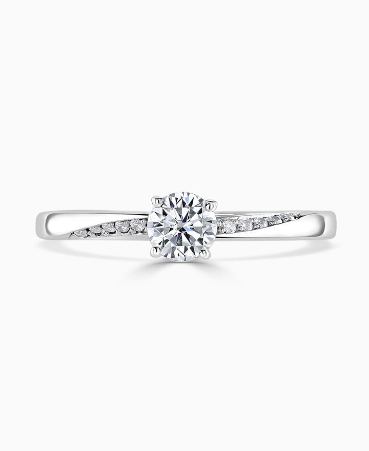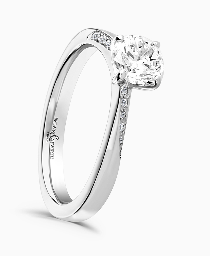 Handcrafted by Brown & Newirth; a delicate four claw setting perfectly elevates the round brilliant cut diamond, presented here on a band with twisted diamond set shoulder detail. Centre 0.33ct, total 0.39ct.