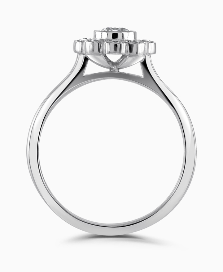 Handcrafted by Brown & Newirth; a diamond halo in art deco style frames the round brilliant cut diamond, presented here on a straight edged band. Centre 0.25ct, total 0.35ct. Part of the Vintage Collection