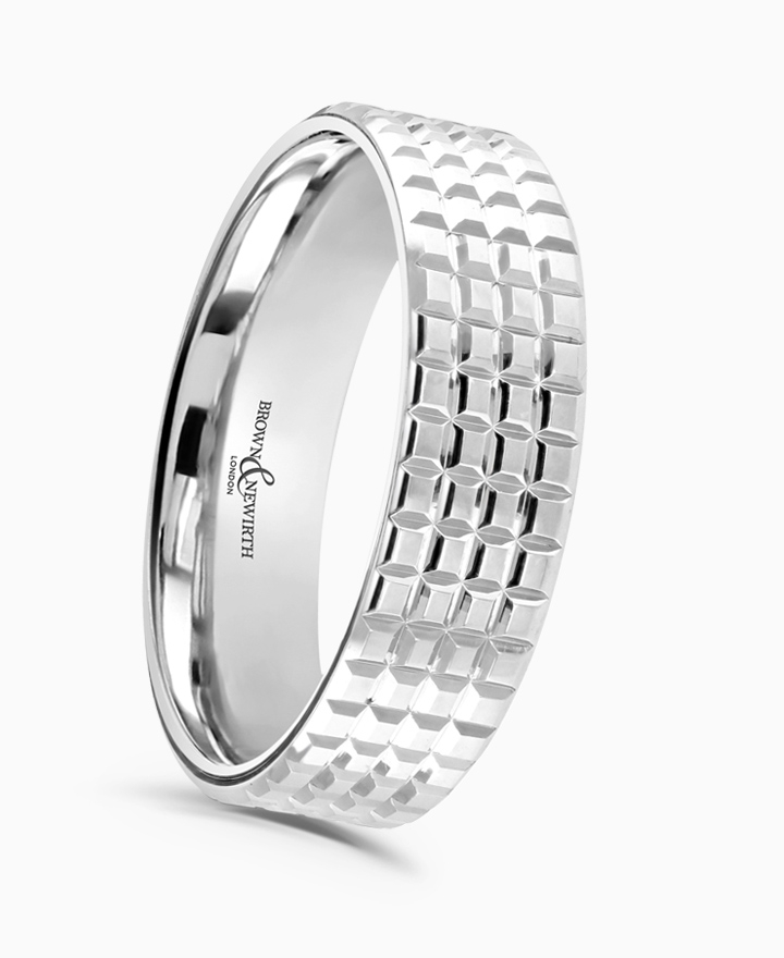 Handcrafted by Brown & Newirth; our flat top profile with cube patterning and square edges, presented in a medium gauge. Part of the Chocolate Collection