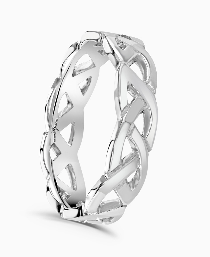 Handcrafted by Brown & Newirth; our open work Celtic design on a flat profile, presented in a medium gauge.