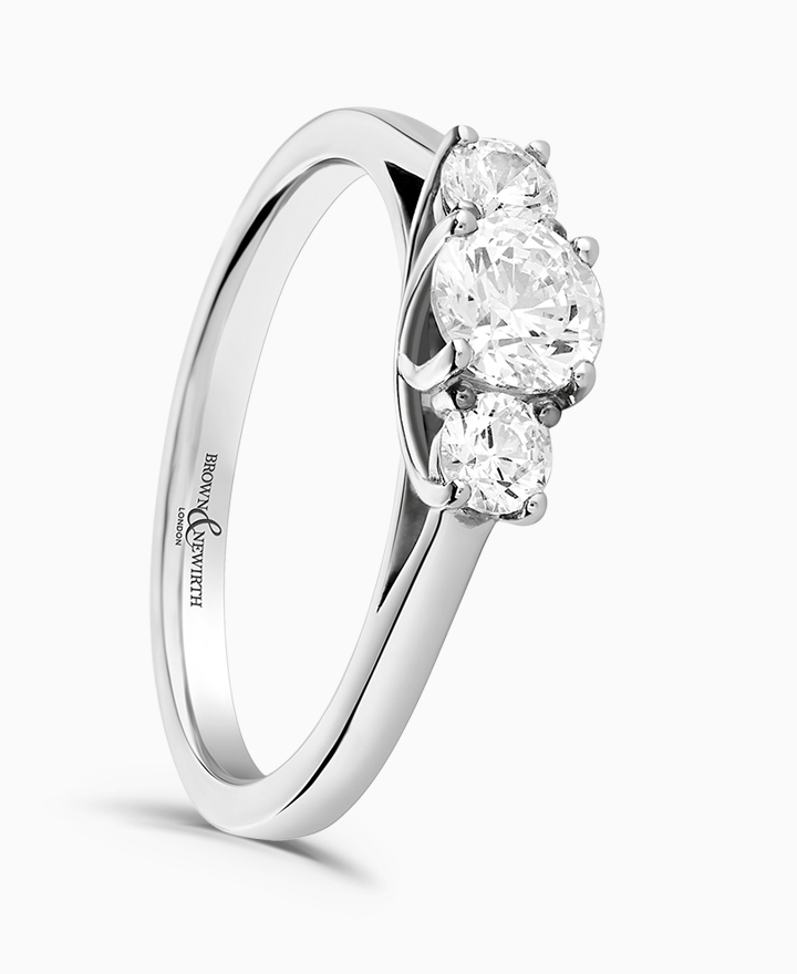 Handcrafted by Brown & Newirth; a classic claw set trilogy of round brilliant cut diamonds, presented here on a straight edged band. Centre 0.50ct, total 0.76ct.