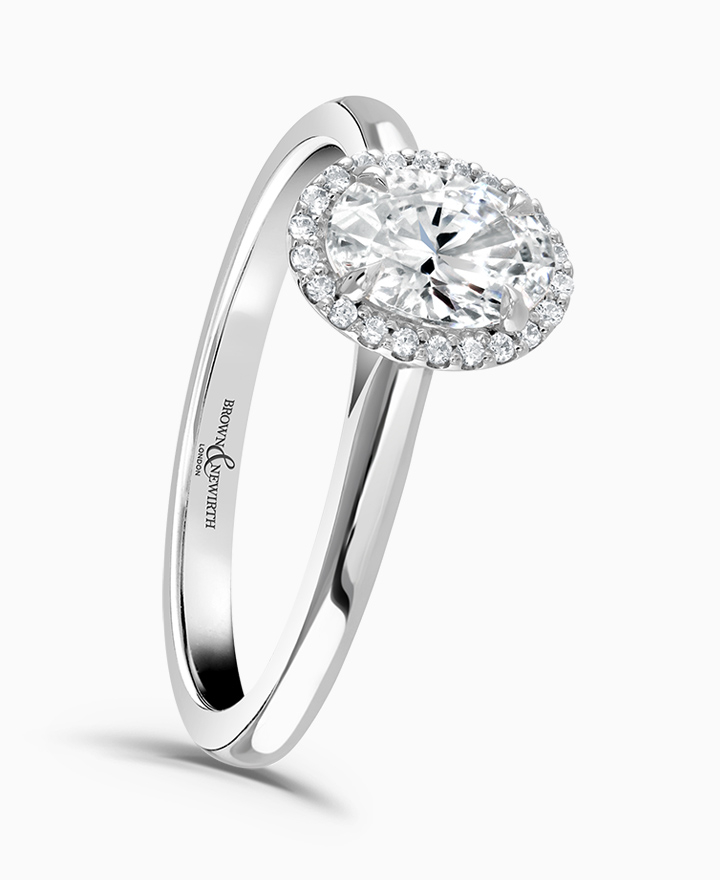 Handcrafted by Brown & Newirth; our signature 'bloom' floral detailing with diamond halo framing an oval cut diamond, presented here on a classic court band. Centre 0.25ct, total 0.28ct. Part of the Bloom Collection.