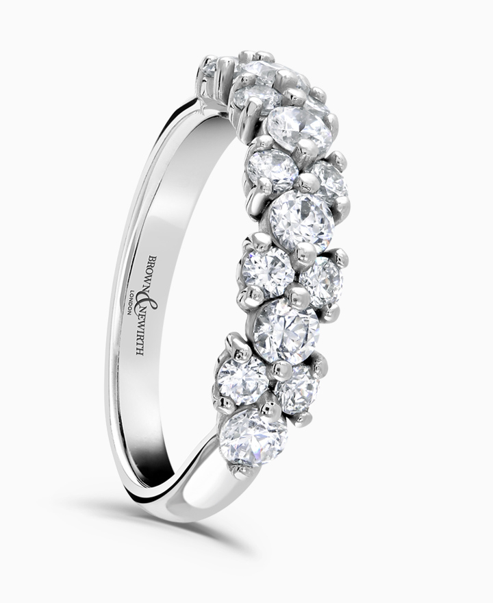 Handcrafted by Brown & Newirth; hopscotch set round brilliant cut diamonds adorn 40% of this classic court band. Total carat weight 0.50ct