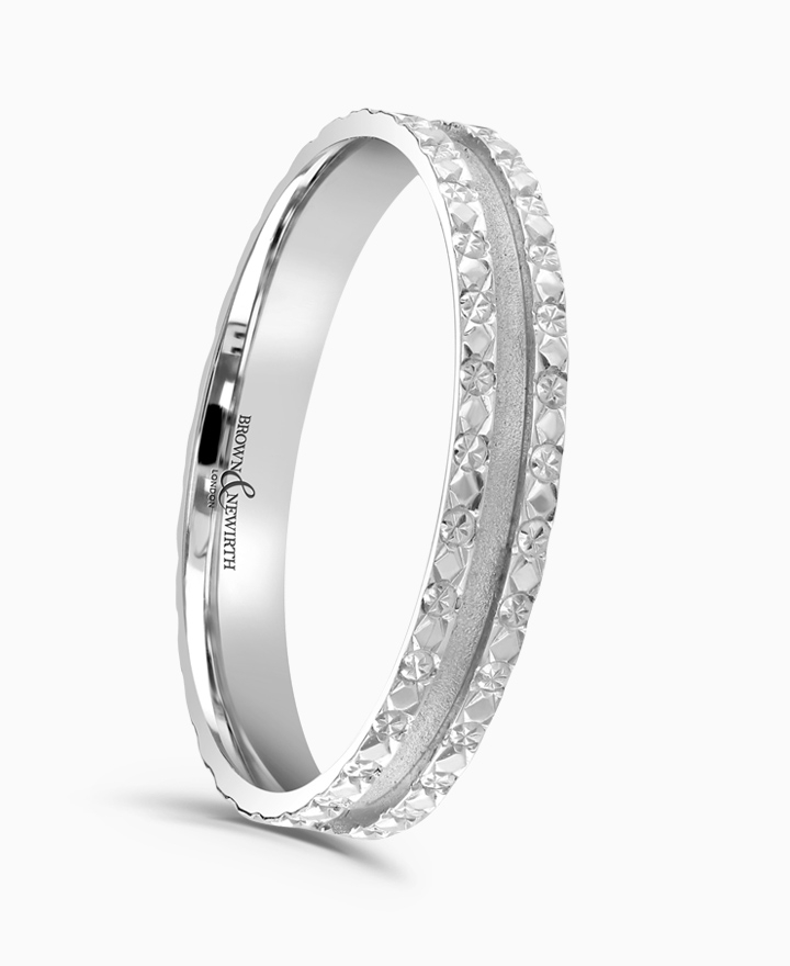 Handcrafted by Brown & Newirth; our flat top profile with sparkle cut edges and contrast matte centre, presented in a heavy gauge.