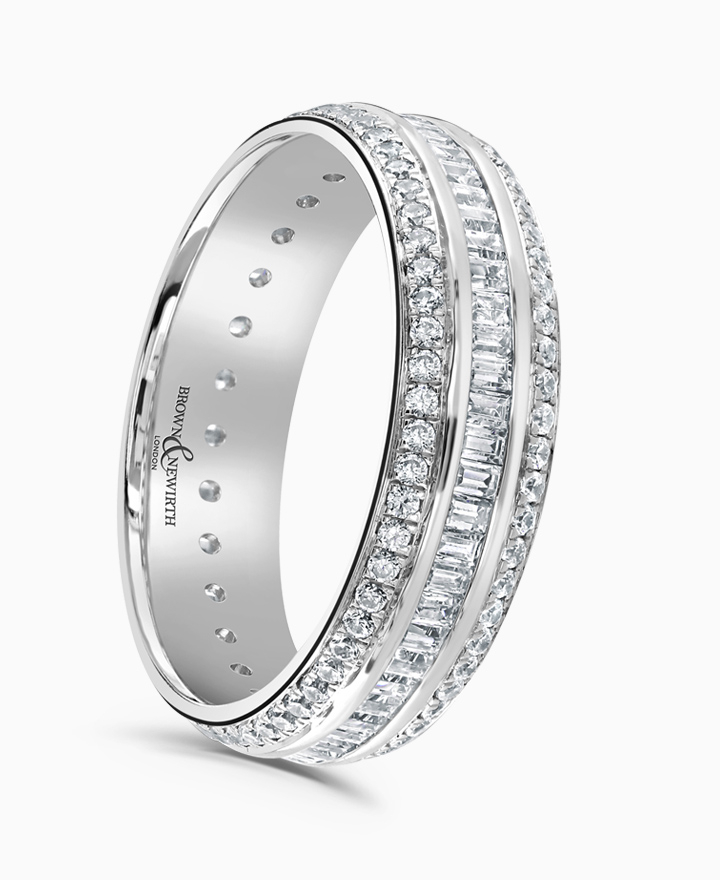 Handcrafted by Brown & Newirth; a triple row of rectangular baguette and round brilliant cut diamonds in a pave setting adorn the full hoop of this classic court band. Total carat weight 1.25ct