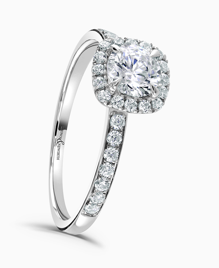 Handcrafted by Brown & Newirth; a squared diamond halo frames the round brilliant cut diamond, presented here with diamond set shoulders. Centre 0.30ct, total 0.60ct.