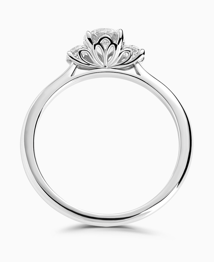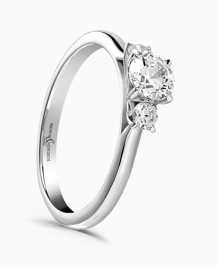Handcrafted by Brown & Newirth; our signature 'bloom' floral detailing for this trilogy of round brilliant cut G Vs diamonds, presented here on a classic court band. Centre 0.30ct, total 0.40ct. Part of the Bloom Collection.