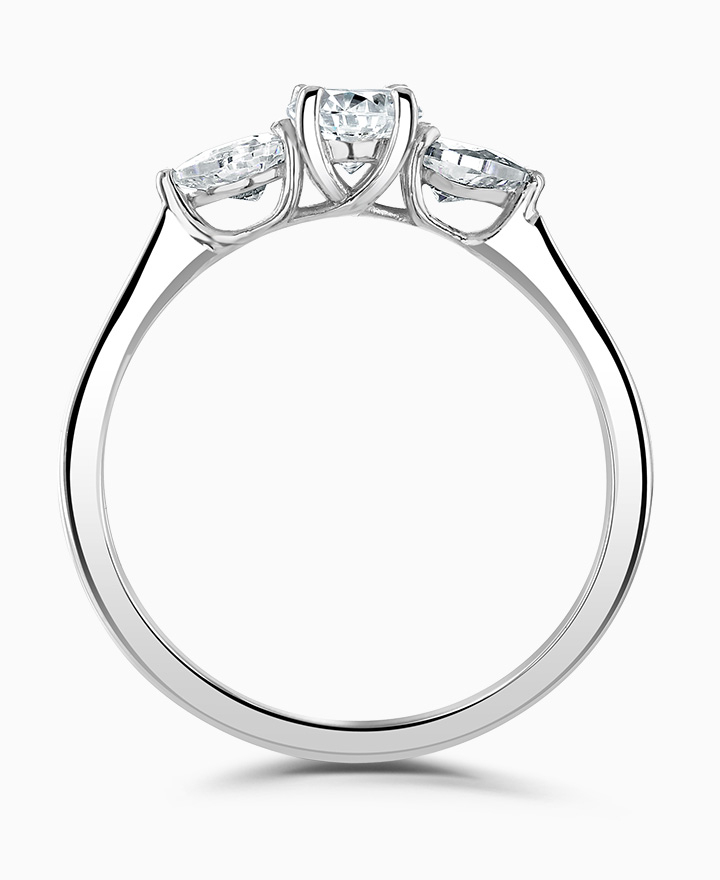 Handcrafted by Brown & Newirth; a claw set trilogy with pear cut diamonds sitting either side of a round brilliant cut diamond, presented here on a straight edged band. Centre 0.33ct, total 0.53ct.