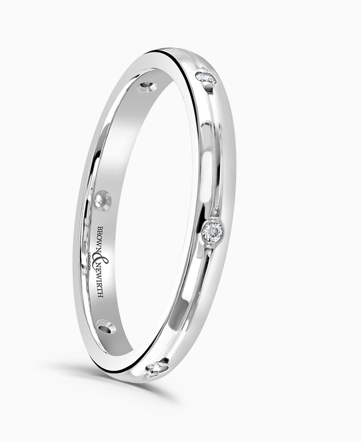 Handcrafted by Brown & Newirth; round brilliant diamonds set around the full hoop with fine line detail, presented in a classic court band. Total carat weight 0.07ct