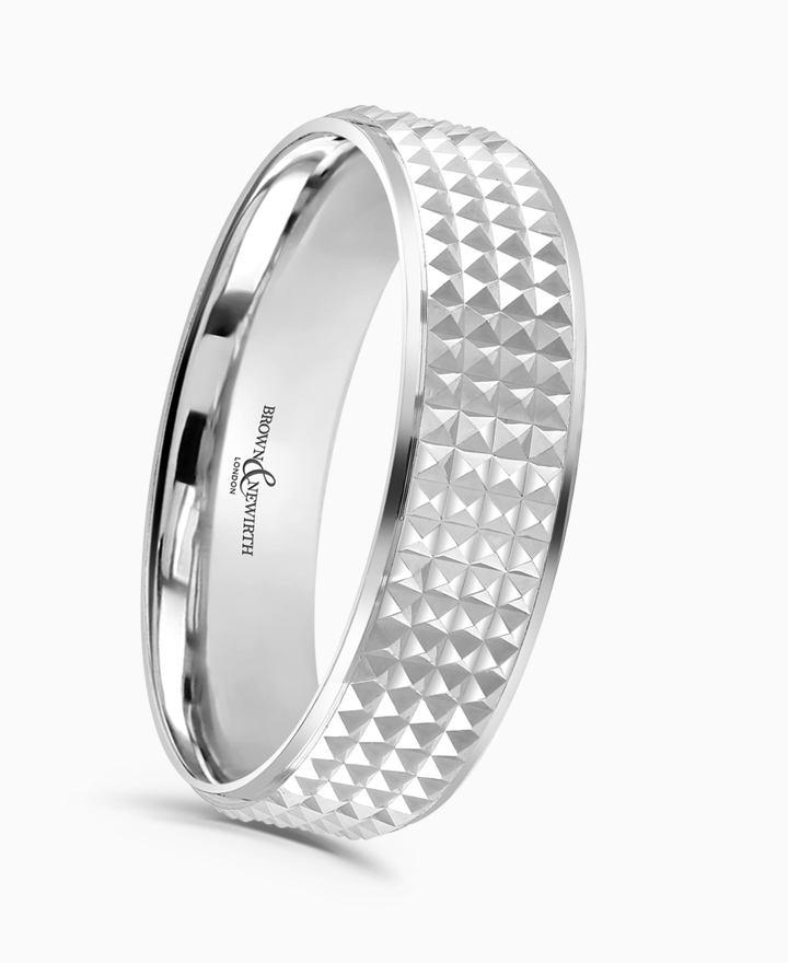 Handcrafted by Brown & Newirth; our flat top profile with knurled patterning and contrasting polished bevelled edges, presented in a medium gauge. Part of the Guilloche Collection